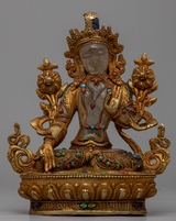 The White Tara Statue Crystal is a magnificent combination of spiritual symbolism and artistic craftsmanship. This statue is painstakingly carved by hand using copper and crystal and embellished with inlaid turquoise and coral stones. Elevated to a height of 21cm and exquisitely electroplated in gold, it radiates visual beauty and profound spiritual significance.