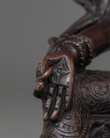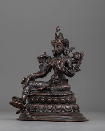 Green Tara is depicted seated in a ready stance with one leg outstretched to respond quickly in times of need. Her right hand is in the varada mudra, indicating infinite giving, while her left hand is holding a utpala lotus, which represents purity and spiritual enlightenment. The oxidized copper body accentuates her heavenly and protective aura, making this statue a powerful spiritual instrument for evoking Tara's blessings of protection, compassion, and guidance on the path to enlightenment.