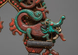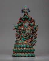 The Turquoise Green Tara Statue is a magnificent example of spiritual elegance and unmatched craftsmanship. This exquisite statue, which is crafted from a solid copper body and carefully plated in 24k gold, is a shining example of devotion. The delicate inlay of turquoise, coral, and lapis lazuli stones adds a vibrant spectrum of color and meaning to the piece, further enhancing the exquisite detailing.