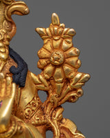 This gorgeous statue has a copper body that has been skillfully crafted and is gilded in 24K gold. Gold and acrylic paintings accentuate the fine details of White Tara's expression and the elaborate patterns on her attire, giving the picture more depth and vitality. Its substantial presence and weight of 0.62 kg make it perfect for any area used for spiritual development, meditation, or introspection.