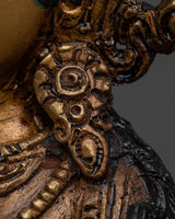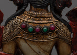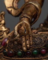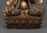 Admire the delicate beauty of the White Tara Buddhist sculpture, which was carefully crafted with minute details and plated in 24k gold and silver. White Tara's divine face radiates with a golden color, illuminating her kind and serene nature. Gemstones that have been skilfully embedded in the sculpture add a touch of radiance and splendor, enhancing the deity's sacred presence. White Tara radiates limitless compassion and wisdom to her followers as she sits on a lotus base, representing purity and enlightenment, with grace and calm. This exquisite work of art encourages spiritual seekers on their path to enlightenment and inner peace by serving as a symbol of hope, healing, and protection.