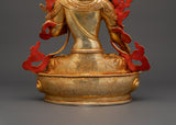 This handcrafted Copper Body White Tara Statue Goddess of Compassion, Healing, Longevity, and Enlightenment, regarded in Tibetan Buddhism as the manifestation of pure feminine energy. This sacred statue, meticulously sculpted from copper and gracefully gold-plated, depicts White Tara's tranquil and compassionate presence, seated in a meditation of peace and grace. The statue, adorned with coral and turquoise stones traditionally connected with protection and healing, has a relaxing and spiritually uplifting energy. It measures 33.5cm in height and 25cm in width and functions as a profound spiritual object and a visually appealing décor piece.