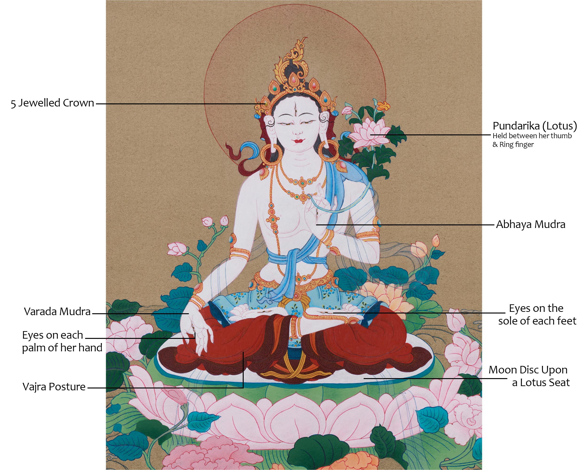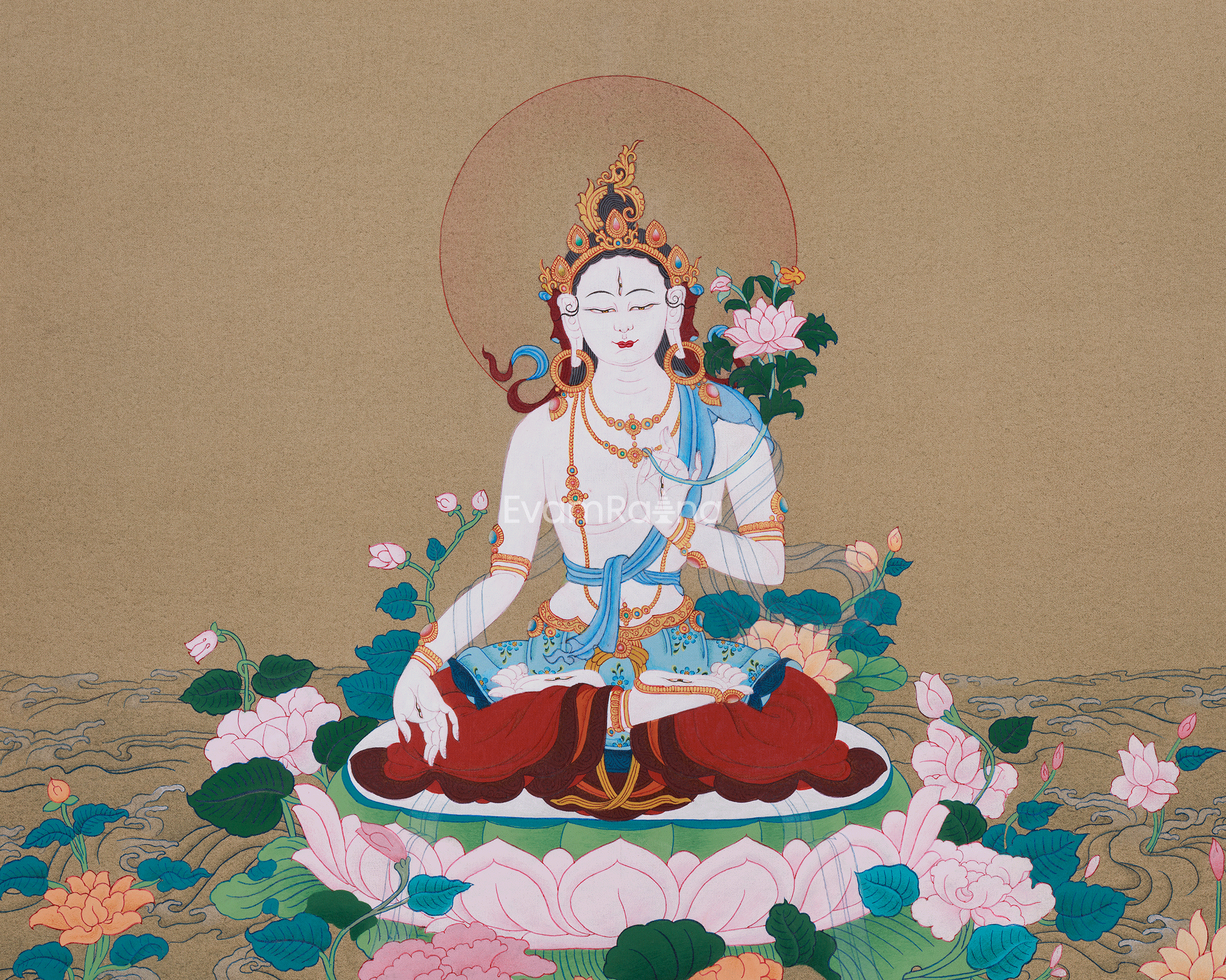 In Tibetan Buddhism, White Tara is a revered female deity symbolizing compassion, healing, longevity, and protection. She sits on a lotus throne in a vajra posture, representing purity and enlightenment. Her right hand is in Varada Mudra, offering blessings and compassion, while her left hand at her heart in Abhaya Mudra cradles a blooming lotus, signifying wisdom and purity. Adorned with a five-jeweled crown, golden ornaments, and silk scarves, her seven eyes symbolize omniscient awareness, perceiving suffering across realms and responding with motherly compassion.