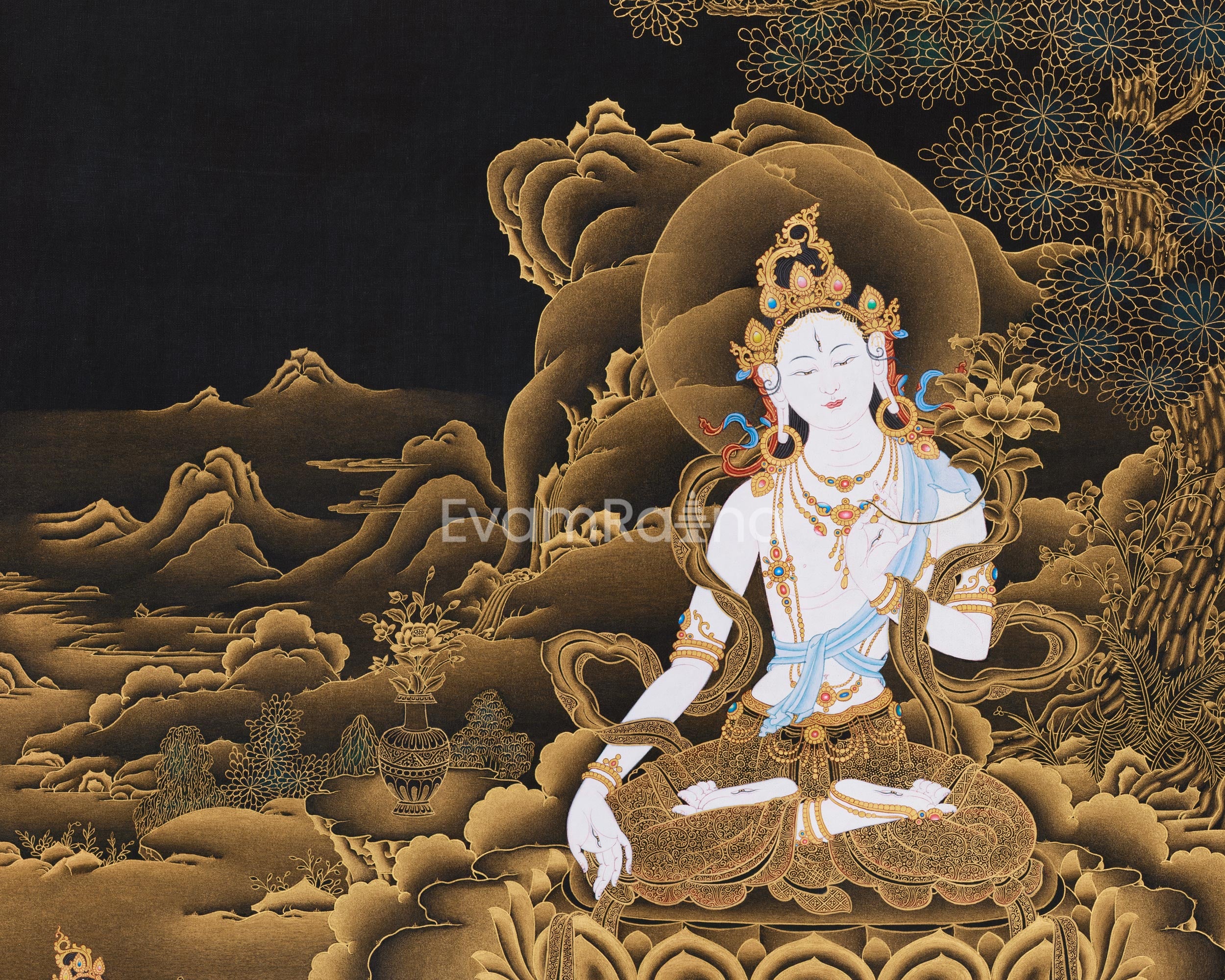 In this painting, she is shown seated elegantly on a blooming lotus throne; her serene white form exudes divine purity. Her right hand is extended downward in varada mudra, symbolizing generosity, while her left hand holds a blooming flower. Adorned in golden ornaments and delicate silks, her presence glows against the black background, embodying calm strength and eternal light. At the base of the thangka, offering goddesses present ritual gifts and lotus blooms, symbolizing reverence and devotion. The golden mountains, rivers, and clouds surrounding her shimmer with a dreamlike luminosity, creating a tranquil spiritual atmosphere that draws the viewer into deep contemplation.