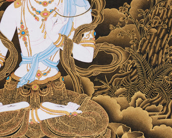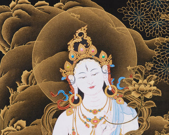 Radiating divine elegance and luminous artistry, this White Tara Bodhisattva Painting is an awe-inspiring hand-painted thangka that encapsulates timeless beauty and spiritual grace. Carefully created on fine cotton canvas with acrylic pigments and 24K gold, this masterwork exemplifies artistic precision and spiritual devotion. The Nakthang style—gold on black—creates a striking contrast, with the gold's brilliance illuminating the dark background like divine light penetrating the void. Every detail, from Tara’s robe folds to clouds and lotuses, radiates sacredness. The 24K gold enhances visual splendor and symbolizes wisdom, purity, and enlightenment. Made by a skilled Nepali artist, this thangka embodies devotion and discipline from the Karma Gadri lineage, offering aesthetic beauty and spiritual peace.