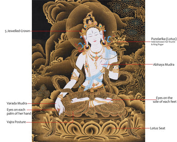 White Tara, also known as Sitatara in Sanskrit, symbolizes long life, compassion, and healing. As a key figure in Tibetan Buddhism, she's regarded as the mother of all Buddhas and a savior who relieves suffering. Legends describe her vow to protect beings across lifetimes, blessing followers with health, longevity, and clarity. Her seven eyes—on her face, palms, and soles—represent her awareness and compassionate vigilance. Her mantra, Om Tare Tuttare Ture Mama Ayuh Punya Jnana Pustim Kuru Svaha, purifies karma, cures illnesses, and prolongs life through her grace.