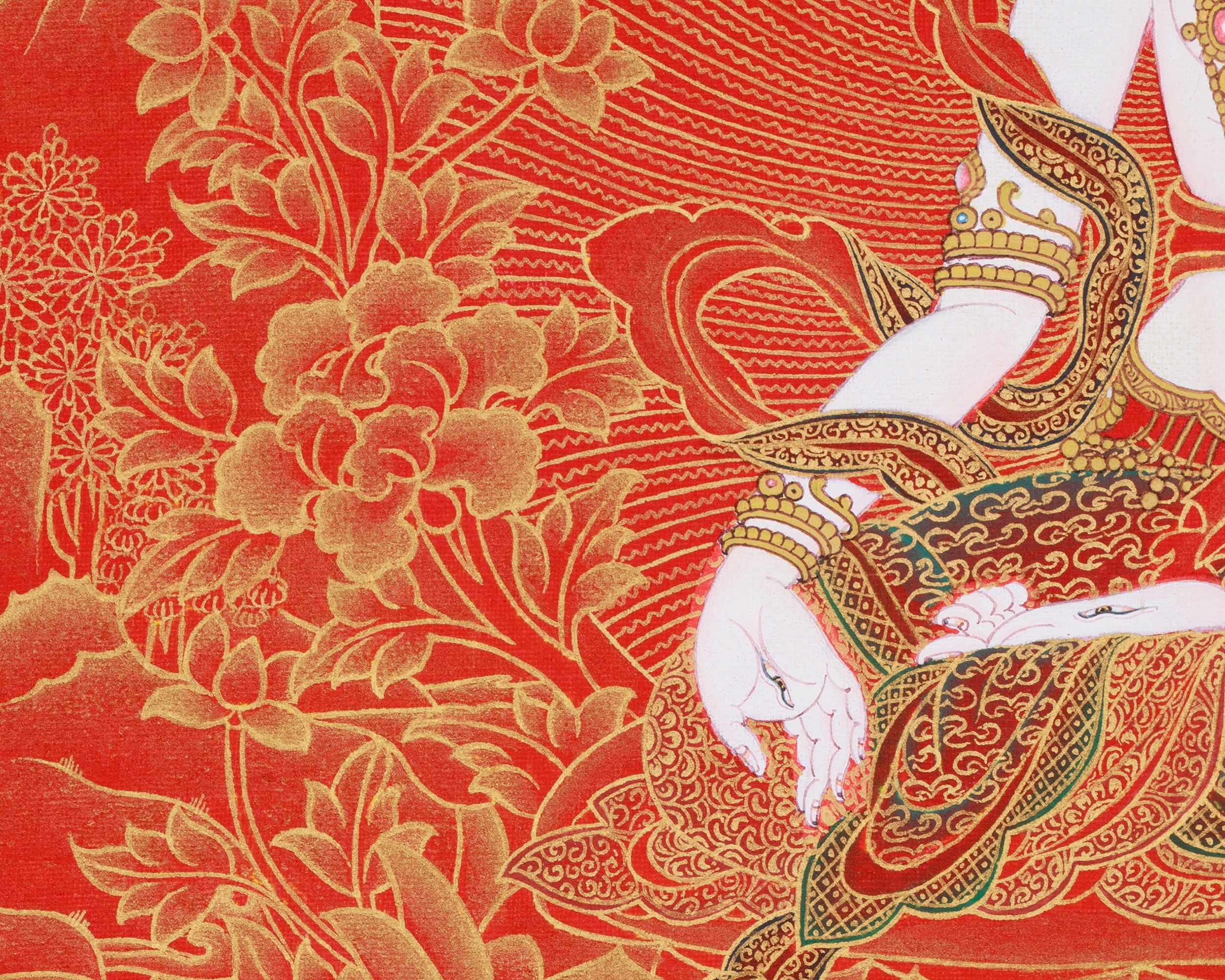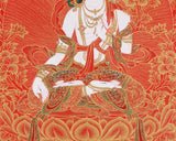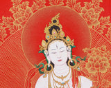 Original Hand-Painted Tibetan Healing Goddess White Tara Thangka | Gold on Red Artwork Radiating Healing Energy and the Blessings of Longevity
