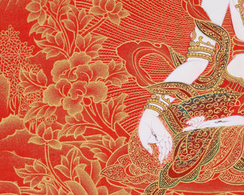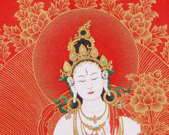 Created in our Enlightenment Studio, this Tibetan Healing Goddess White Tara thangka is a hand-painted masterpiece in the Nakthang (Gold on Red) style. Painted on cotton with acrylics and 24K gold, it radiates artistic and spiritual sanctity. The gold glows against the deep red background, symbolizing divine vitality, with delicate brushwork capturing sacred contours. The revered Nakthang technique signifies purity, spiritual light, and transcendence of suffering. This shimmering thangka is a consecrated symbol of compassion and healing.