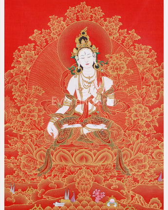 White Tara, the Goddess of Longevity and Healing, sits serenely on a lotus throne. Her radiant white body symbolizes purity and compassion that dispel illness and restore balance. She wears flowing silks and jeweled ornaments, with a serene expression, and her right hand gestures in blessing. Her left hand cradles a blooming lotus, symbolizing wisdom and compassion. Seven eyes on her face, palms, and soles represent awakened awareness, watching over all beings needing healing and protection. Gold lotus motifs surround her, evoking the celestial realm of peace and vitality. This thangka embodies divine harmony, highlighting Tara’s longevity, serenity, and compassion.
