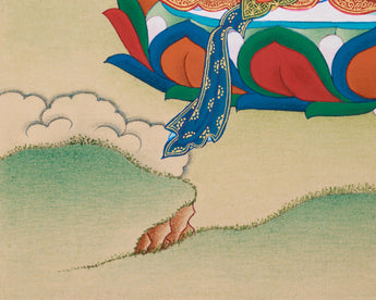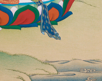 White Tara Buddhist art symbolizes longevity, healing, and compassionate protection through its hand-painted design. In Tibetan Buddhism, she is cherished as the Goddess of Long Life, often called upon to support our physical health, strengthen our spirits, and help clear the obstacles on our journey to enlightenment. It is painted on cotton canvas with acrylics and finished with genuine 24K gold, adding luminosity and authenticity to her serene form. Created by master artisans in our Enlightenment Studio, every brushstroke embodies dedication, careful craftsmanship, and the spiritual presence that this gentle deity offers to all beings.