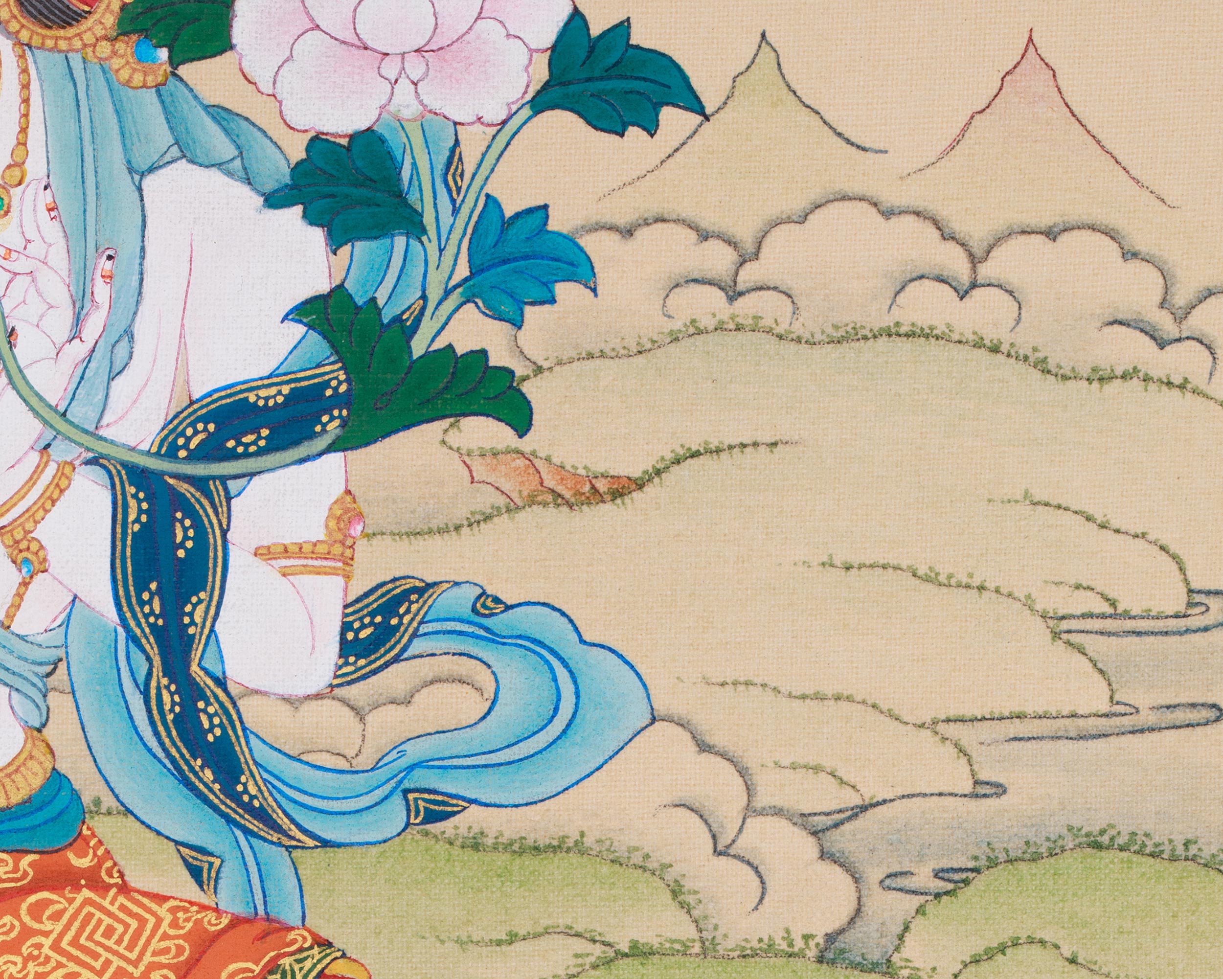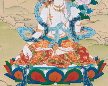 This thangka illustrates White Tara seated in vajra posture on a luminous moon disc and lotus platform, wearing a five-jeweled crown, sacred jewelry, and flowing silk robes. Her right hand is in the varada mudra, symbolizing charity, while her left hand is raised in the abhaya mudra, offering reassurance and protection. She grasps the stem of a pundarika (white lotus), which represents purity and spiritual enlightenment. White Tara's seven eyes highlight her omniscient awareness and compassion for suffering. From the bloom of her lotus to her gentle expression, every detail underscores her boundless love and healing energy.