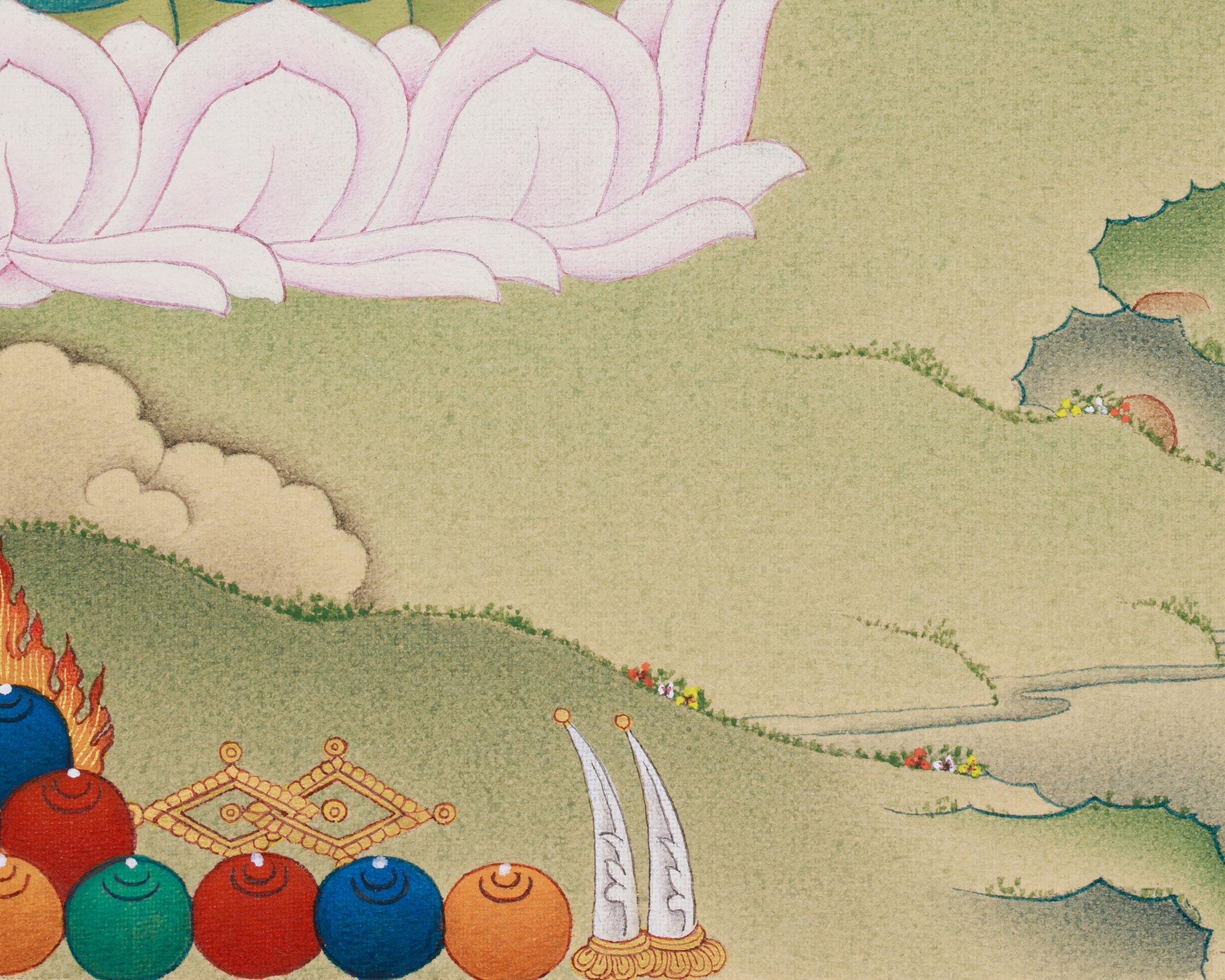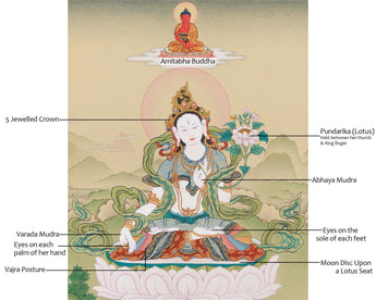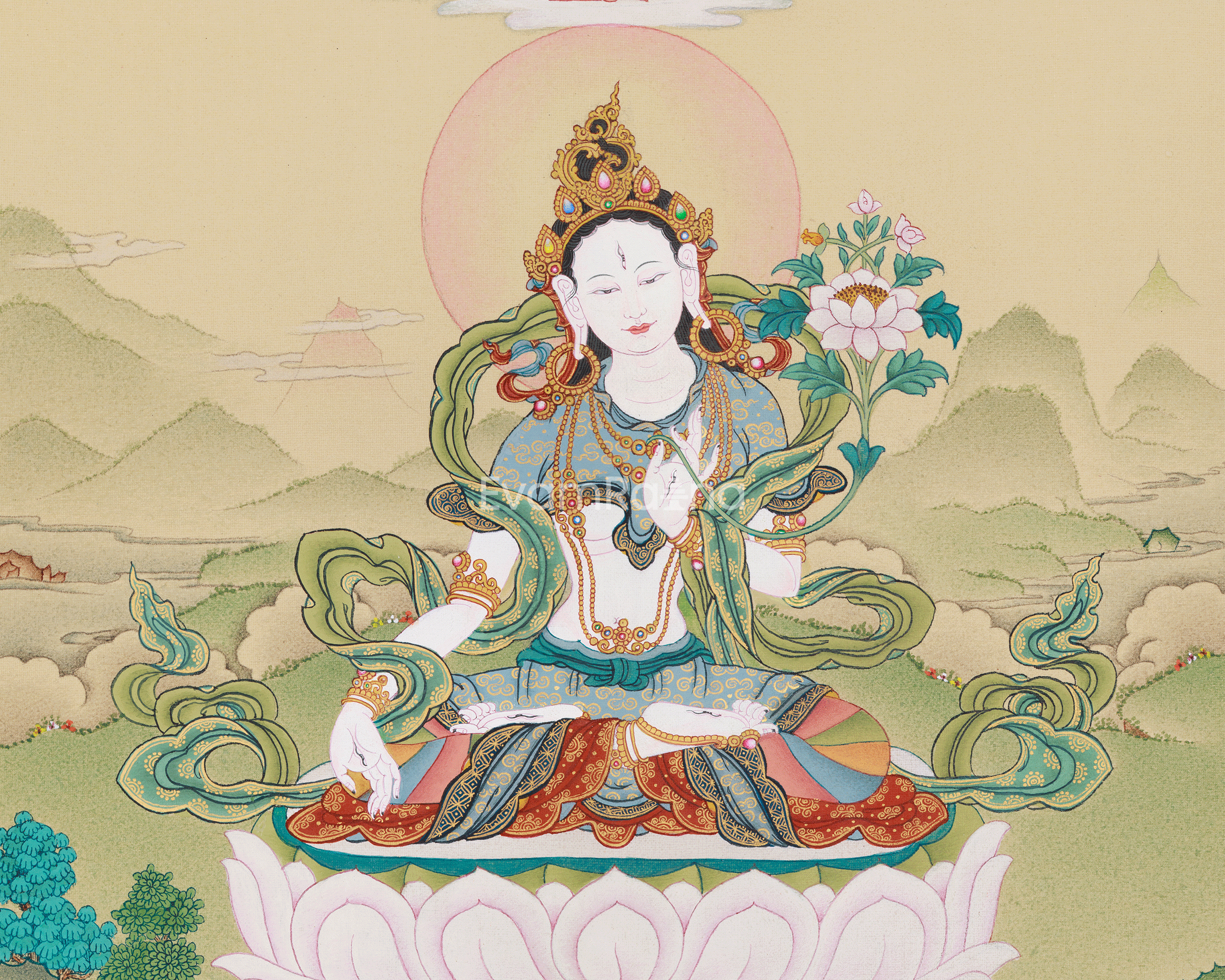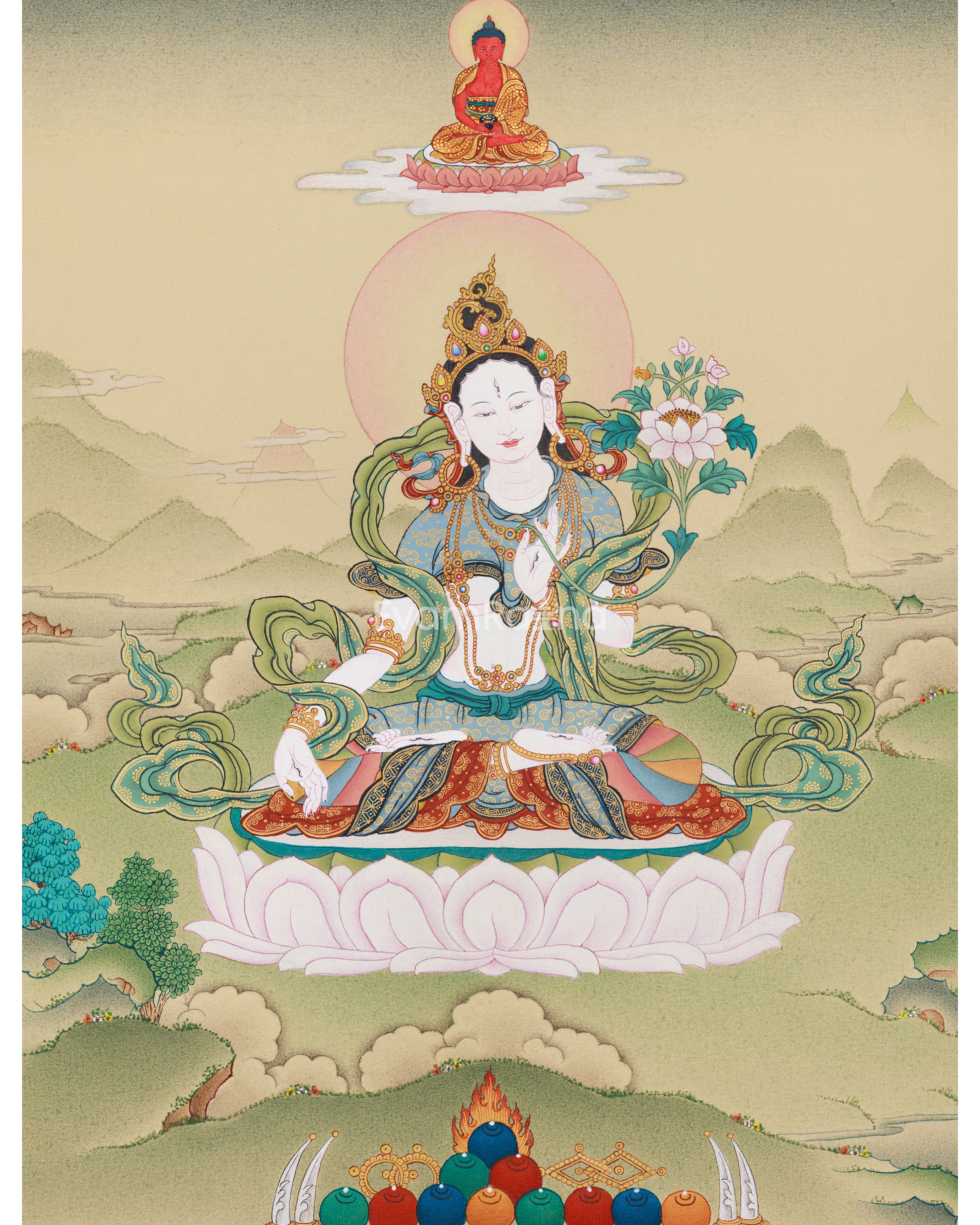 In Tibetan Buddhist tradition, White Tara is revered as the goddess of compassion and longevity, symbolizing protection, healing, and long life. She is depicted with seven eyes, symbolizing her ability to perceive the suffering of all sentient beings and to offer compassionate protection. Amitabha Buddha, known as the Buddha of Infinite Light, is closely associated with White Tara and embodies endless love, compassion, and wisdom. White Tara is gracefully seated on a lotus throne in this thangka, radiating peace and elegance.