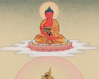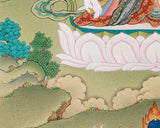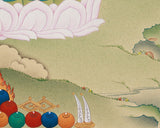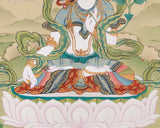 Experience the spiritual tranquility of this White Tara with Buddha Amitabha thangka, a meticulously hand-painted work of art. Created in the traditional Karma Gadri style on high-quality cotton canvas, it features natural Lhasa stone colors and 24K gold accents. Renowned for its fine brushwork and vibrant colors, the style highlights the divine elegance and purity of White Tara, promoting a sense of peace and healing. This ancient Tibetan technique, handed down through generations, captures the spiritual essence of the figures, offering not just a visual display but also a deep spiritual experience.