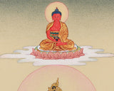 Amitabha Buddha is shown above her, sitting on a cloud and radiating light and wisdom onto her. Their bond symbolizes the harmony of wisdom and compassion, with Amitabha’s spiritual glow guiding White Tara’s healing and protective energy. This thangka not only depicts their divine forms but also underscores the deep harmony among these sacred figures, inspiring viewers with a sense of peace and spiritual growth.