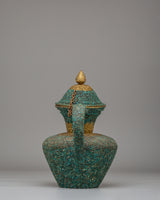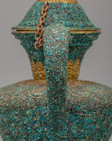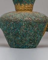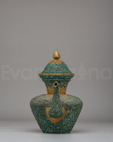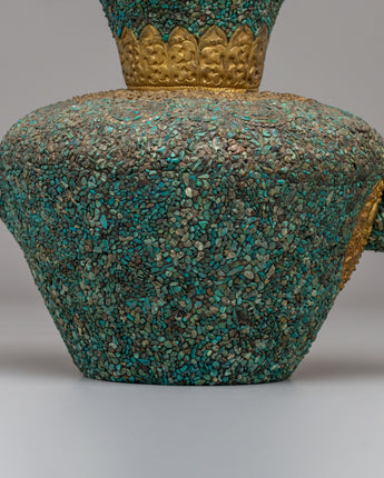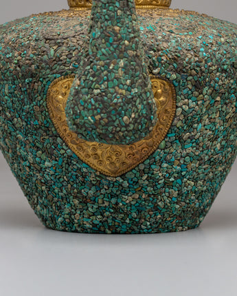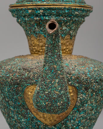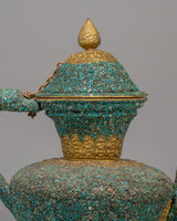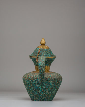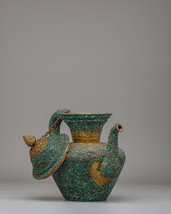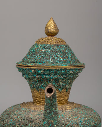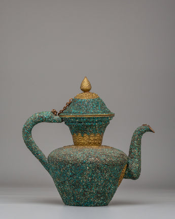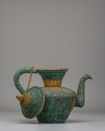This handcrafted traditional Tibetan-style teapot showcases the craftsmanship of Himalayan tea-making traditions. Made from copper and beautifully inlaid with turquoise stones, this teapot measures 31 cm in height and 32 cm in width, weighing 1.97 kg. It features a spout and a gracefully curved handle, making it both functional and visually appealing for any tea ceremony or home decor. Its elaborate floral designs and sacred motifs reflect the spiritual essence of Tibetan rituals, where tea symbolizes hospitality. Whether used to serve tea or as a decorative centerpiece, this teapot adds warmth and cultural significance to your space.
