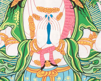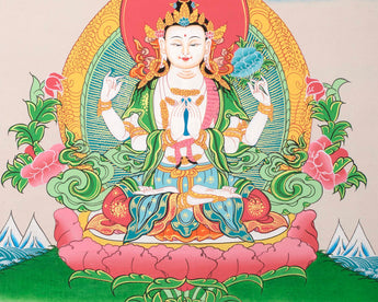 Our thangka paintings are Buddhist canvas paintings made with the use of gold and other natural colors, depicting Buddhist deities, scenes, or mandalas. We beautifully have hand-painted this thangka of Tibetan Chenrezig.