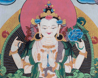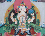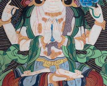 The god 4 Armed Chenrezig is shown in this Chenrezig thangka (Avalokitesvara). Avalokitesvara is a combination of the verbal prefix ava "down," lokita "observe," and lastly isvara "lord." As a result, Chenrezig is the most revered 'Bodhisattva' who embodies all Buddha's compassion. Chenrezig hears our prayers in times of struggle and stress.