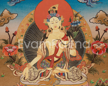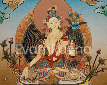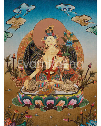 White Tara is depicted seated gracefully on a lotus seat, surrounded by lush, vibrant flora. She holds a lotus flower in one hand, symbolizing purity, while her other hand is held in a gesture of blessing and protection.