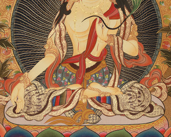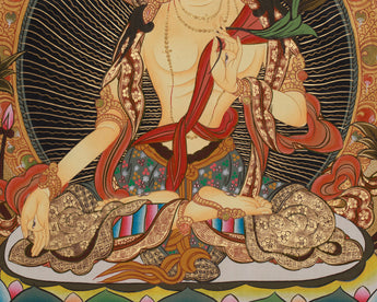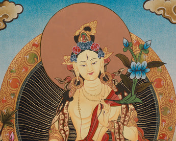 These hand-painted thangkas present two beautiful variations of Tara White, the goddess of compassion, healing, and longevity. Celebrated for her calm energy and protective attributes, White Tara is known for her capacity to provide longevity and shield her followers from harm. Within this collection, you can select between two beautiful representations of White Tara, each emanating divine serenity and spiritual healing.