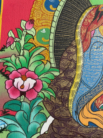 Guru Rinpoche, also known as Padmasambhava, is a highly revered figure in Tibetan Buddhism and is often considered the "Second Buddha." He is believed to have been instrumental in introducing Buddhism to Tibet in the 8th century. Guru Rinpoche is depicted as a masterful and compassionate teacher, holding a Vajra (thunderbolt) and a skullcup.