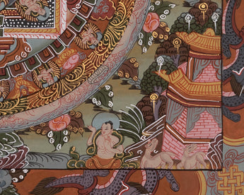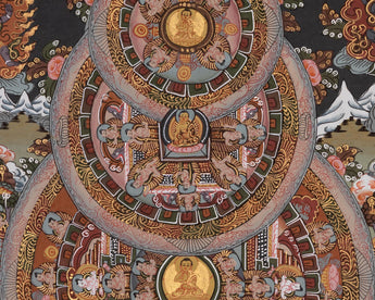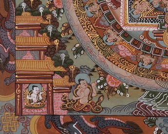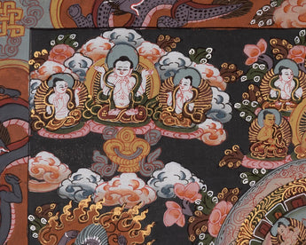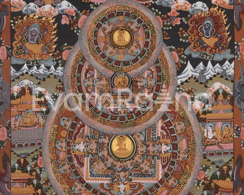 This stunning Three Wheel Mandala Thangka profoundly symbolizes Buddhist cosmology and spiritual understanding. A central Buddha is housed in the three concentric mandalas at the center of this thangka, representing various facets of enlightenment throughout history. Dipankara Buddha, the Buddha of the past, is seated at the lowest mandala and is thought to have predicted the arrival of Shakyamuni Buddha. Shakyamuni Buddha, the historical Buddha who became enlightened under the Bodhi tree and propagated the Dharma, is housed in the middle mandala. The Buddha of the future, Maitreya Buddha, is depicted at the topmost mandala. He is predicted to emerge when Shakyamuni's teachings have fallen and bring in a new era of compassion and wisdom. The hand-painted artwork, showcasing acrylic colors and 24K gold accents, enhances the divine energy emanating from the mandala.
