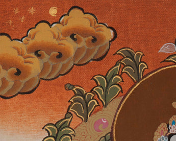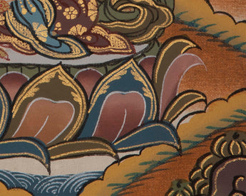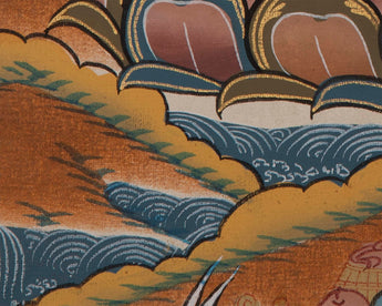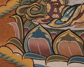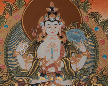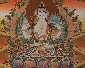 Our thangka paintings are Buddhist canvas paintings made with the use of gold and other natural colors, depicting Buddhist deities, scenes, or mandalas. We beautifully have hand-painted this thangka of Tibetan Chenhrezig.