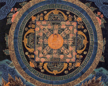 The other mandala depicts Hevajra, a wrathful deity associated with Tibetan Buddhism's Vajrayana tradition, at its center. The intensity of Hevajra's presence is heightened by the surrounding dragon border, symbolizing strength, protection, and transformation. Despite his fierce appearance, Hevajra embodies enlightened wisdom and compassion, guiding practitioners on the path to liberation. The dark blue color palette further enhances the mandala's mystique, evoking a sense of mystery and depth. As a vintage artifact, this thangka carries the weight of centuries of spiritual practice, making it not only a visually stunning piece but also a profound tool for meditation and contemplation.