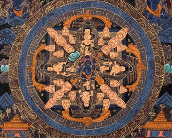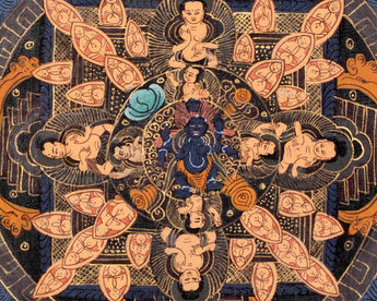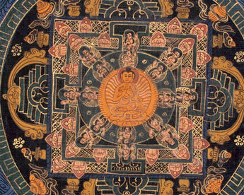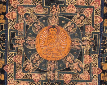The Vintage Buddha Mandala Thangka exudes timeless spirituality, featuring a majestic depiction of the Buddha seated at the center, surrounded by intricate mandalic patterns. The Buddha radiates serenity and wisdom, with his compassionate gaze inviting viewers into a realm of peace and enlightenment. Dark blue, with its depth and richness, serves as the dominant hue. This vintage thangka carries the essence of ancient wisdom and serves as a powerful symbol of introspection and inner peace.