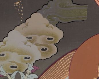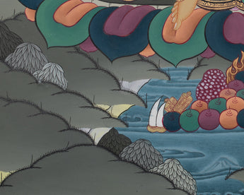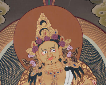 Radiating spiritual wealth and divine energy, the Wealth Deity Artwork depicts Dzambhala, a revered figure known for granting material and spiritual prosperity. This Thangka was hand-painted on cotton canvas by a skilled Nepali artist using traditional methods passed down through the ages. The use of acrylic colors enhances the vitality of the artwork, resulting in rich, vivid tones that capture the heavenly spirit of the deity. Genuine 24K gold has been applied to intricate features such as the deity's robes, crown, and halo, emphasizing the figure's purity and giving the painting a radiant and auspicious appearance. The high-quality materials and skillful artistry ensure that this thangka is a powerful spiritual aid and a durable piece of sacred art.
