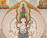 Chenrezig, one of the most popular Bodhisattavs, is also popularly known as Avalokitesvara. In Vajrayana Buddhism, Chenrezig means gazing with the eyes of compassion in Tibetan words. Avalokitesvara Thangka is used to do visual meditation practice to develop a calm, kind, and compassionate heart.