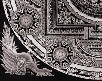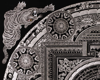 At its core, the mandala features the Eight Auspicious Symbols of Tibetan Buddhism, each representing a unique blessing: wisdom, protection, abundance, and the path to enlightenment. The design surrounds these sacred emblems with mythical creatures, such as the tiger, turtle, dragon, and celestial bird. This print not only carries deep spiritual meaning but also invites reflection, balance, and harmony into any space it graces.