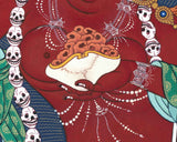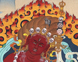 The deity known as Dorje Phagmo or Vajravarahi is a fierce representation of the goddess Vajrayogini. She is known for her transformative abilities, wisdom, and protective powers. In this artwork, she is portrayed with a red body, wearing a crown made of five skulls on her head and a necklace of severed heads around her neck. She is often depicted standing, holding a curved knife and skull cup in each hand. For the Vajrayana practitioners, this Vajravarahi thangka print will be helpful to inspire your practice.