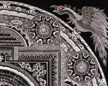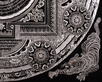 The mandala's four corners are anchored by powerful guardian creatures: the tiger, turtle, dragon, and bird. These beings energetically reinforce the sacred geometry, making the mandala a visual masterpiece and a spiritual tool for meditation, balance, and symbolic protection in your sacred space.