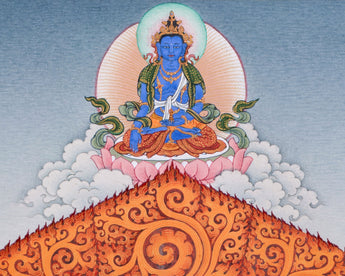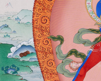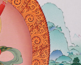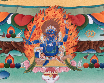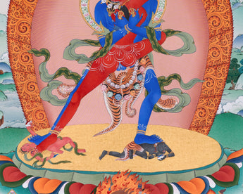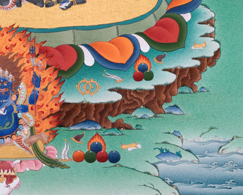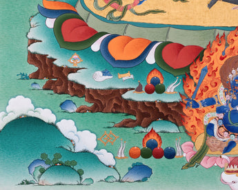 Centered in the image, Chakrasambhara is depicted in harmony with Vajravarahi, representing the fusion of wisdom and compassion. Below them, the fierce guardian Mahakala radiates powerful energy, safeguarding the practitioner from obstacles and harm. At the top, Mitrupa is depicted in deep meditation, representing the lineage and mastery of tantric practice. Encircled by a halo of flames and set against a serene landscape, this thangka print blends wrathful and peaceful energies, making it a powerful meditative aid and a visually striking sacred artwork. It is perfect for practitioners, collectors, and anyone looking to invite blessings, protection, and wisdom into their environment.
