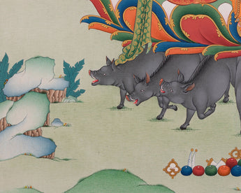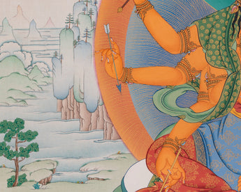 Radiating divine brilliance, this Goddess Marichi Thangka Print is an exemplar of high-quality reproduction, encapsulating the sacred beauty and symbolic depth of the original artwork. Created on durable canvas with vivid detail and rich color, it preserves the essence of traditional Tibetan thangka painting while allowing customization to your preferred dimensions. Ideal for meditation rooms, personal altars, or sacred decor, this print functions as both a devotional artifact and a potent reminder of spiritual protection and blessings.
