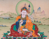 A high-quality thangka digital print of Guru Rinpoche, the "Lotus-Born" guru of Tibetan Buddhism, is exclusive to the Guru Rinpoche Empowerment practice. This poster expertly captures the essence of Guru Rinpoche's spiritual strength and presence with its rich color palette and meticulous detail. Every element of the iconography, from his serene expression to the twirling patterns on his robes, is filled with symbolism and significance. For his teachings on compassion, wisdom, and the road to enlightenment, Guru Rinpoche is beloved by many practitioners as a source of inspiration and direction. This poster will likely provide joy and significance to your home or shrine, whether you want to strengthen your spiritual practice or simply admire the beauty of sacred art.