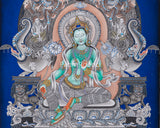 Bring the compassionate and protective energy of Green Tara Guru into your home or spiritual practice with this captivating paubha painting print. Green Tara is a beloved figure in Tibetan Buddhism, known for her swift and immediate response to those who call upon her for help. Her vibrant green form symbolizes her ability to grant wishes and bring prosperity, while her multiple arms represent her ability to aid all seeking guidance. This paubha painting print captures her serene and powerful presence, inviting you to connect with her energy and seek her blessings. Display this painting in your space as a daily reminder of the guidance and protection that Green Tara Guru can provide.