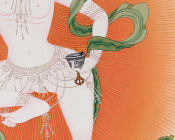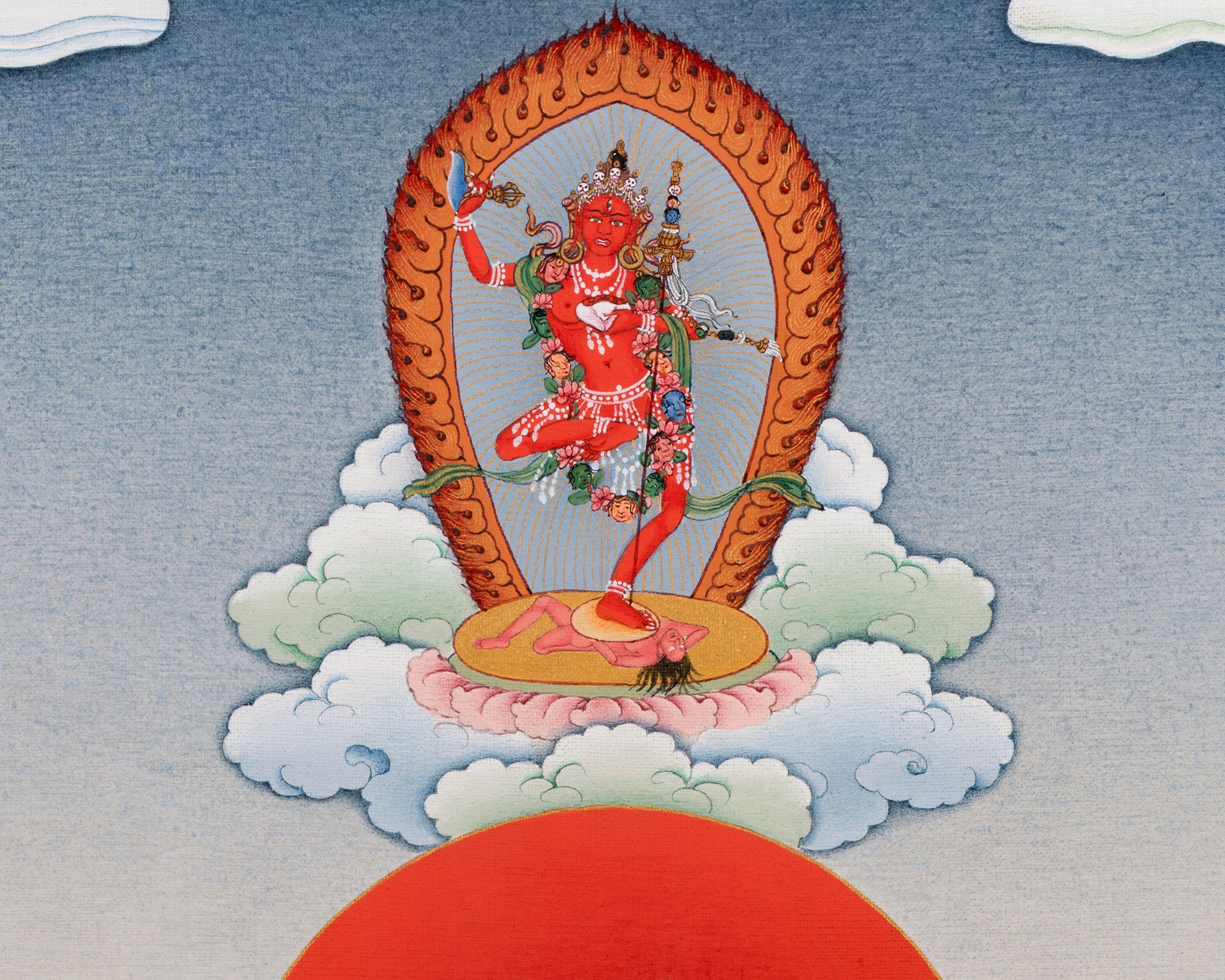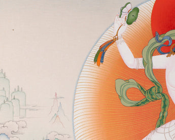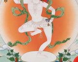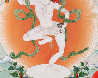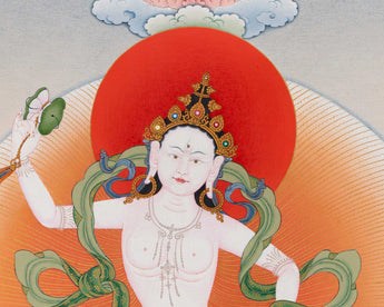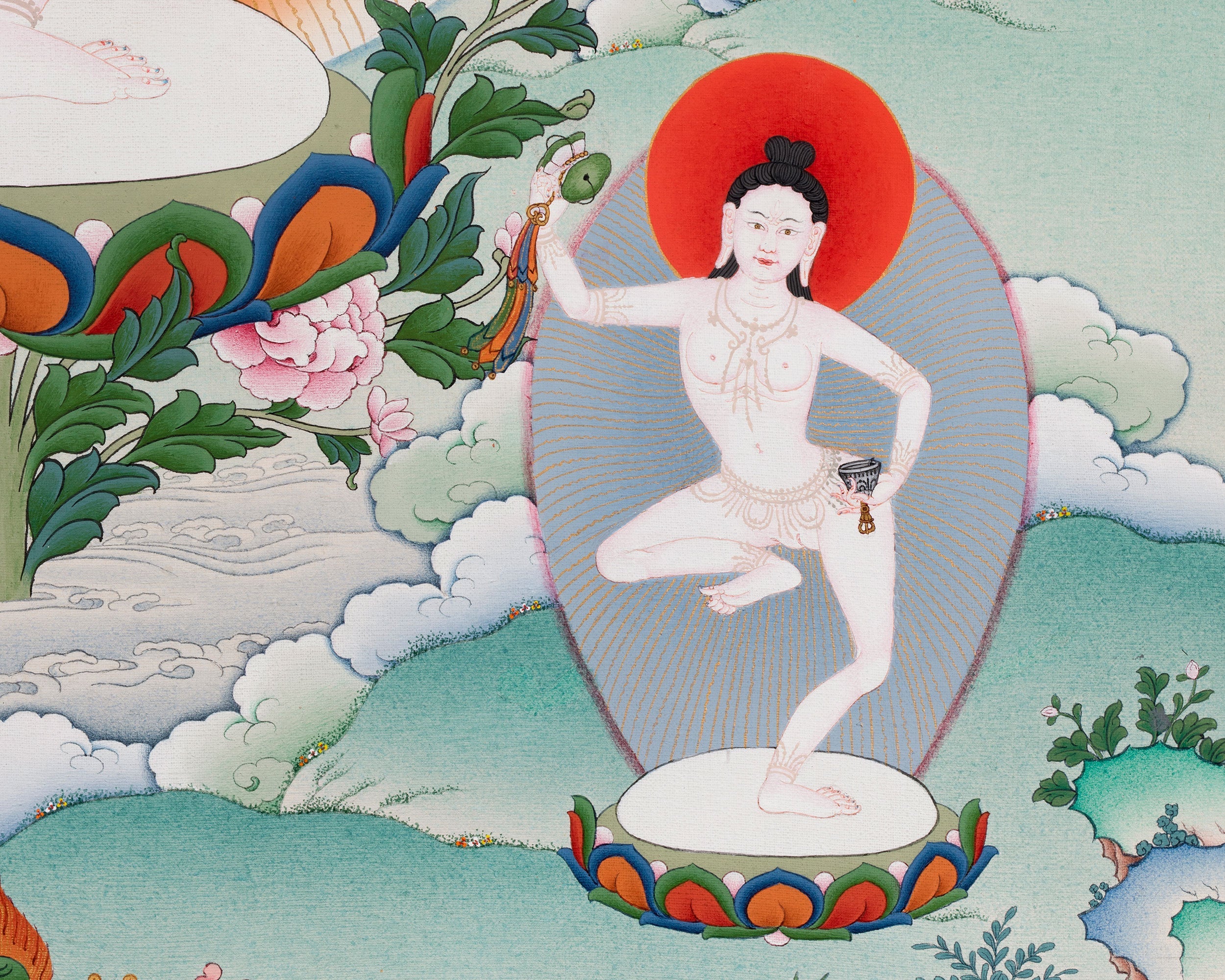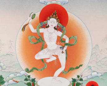 In this print, Machig Labdron is depicted in her radiant white form, dancing on a lotus pedestal with a damaru (ritual drum) and bell—symbols of wisdom and method, central to the practice of Chod she established. Above her appears Vajravarahi, the red dakini, representing fierce compassion and transformation. Beneath her, another dancing dakini and a meditative practitioner appear, symbolizing the depth and ongoing nature of her teachings. They are shown together to highlight the unbroken lineage of empowerment, practice, and realization—illustrating Machig’s connection to Vajravarahi and the living tradition her disciples continue. This Machig Labdron print combines devotion, lineage, and artistic mastery, making it a powerful focus for meditation, ritual, or sacred display.