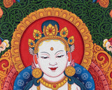 Through this beautiful thangka print, Vajrasattva's transformational power is made manifest and is ideal for the practice of the Mantra of Vajrasattva. Vibrant hues and minute details are used to create a fantastic representation of Vajrasattva, the personification of purity and spiritual cleansing. His physical features are displayed in print, such as his calm demeanor, the vajra he holds in his hand, and the traditional Buddhist crown on his head. The print's tranquil background lets the observer concentrate on Vajrasattva's serene countenance and potent symbolism. The print also includes the Vajrasattva mantra, which invokes the blessings of cleansing and spiritual change from a deity. This Vajrasattva thangka print will infuse your life with good energy and mindfulness. It is the ideal complement to any spiritual practice or home décor collection.