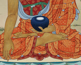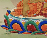 The Thangka print of Seated Shakyamuni Buddha is a work of traditional Tibetan art. The deity is portrayed in a radiant nimbus with a luminous halo gracing his visage. Resting on a lotus throne, he holds an alms bowl in his left hand while his right-hand represents an earth-touching mudra. The secenary and the clouds emanates tremendous energy, which a practitioner like yourself will feel. The color combination in the canvas print looks stunning. You can use this tibetan poster for various purposes, such as in your regular meditational or yoga activities, in different Buddhist rituals, and for home décor things.