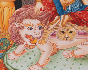 Lokeshvara's lion crouches upon a white moon-disc and a lotus that is supported by leaves and buds. The stem of this lotus arises from the waves of a dark lake.Lokeshvara's fierce lion is adorned with a crowning jewel, anklets, a collar of little round bells, and a silk saddle-blanket. With his head turned back towards Lokeshvara the lion gazes forward.