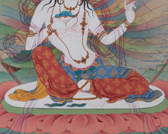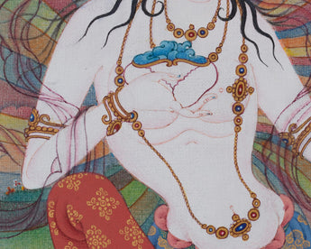 Renowned for her mastery of meditation and her significant role as a teacher in the Shangpa Kagyu lineage, Sukha Siddhi is a celebrated yogini and wisdom dakini from India. Her white form represents purity and spiritual insight, paired with intricate jewelry and a crown featuring five jewels. Holding a kapala, or skull cup, she symbolizes the transformation of attachment into wisdom, while her left hand performs the Karana Mudra, which clears the way. Her presence inspires fearlessness and profound realization in devoted practitioners. This Sukha Siddhi Canvas Print captures her enlightened qualities, making it a powerful focal point for meditation, prayer, and spiritual collections.