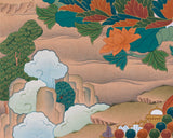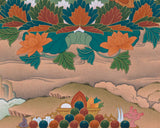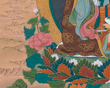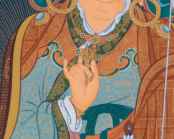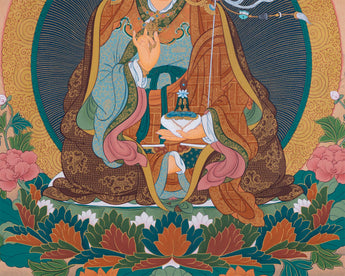 The Thangka Print of the Lotus-Born Master encapsulates the divine presence and profound teachings of Guru Rinpoche, also known as Padmasambhava. Revered as the "Lotus-Born," Guru Rinpoche is celebrated as a pivotal figure in Tibetan Buddhism, revered for his enlightened wisdom and compassionate guidance. This Thangka print, meticulously crafted with vibrant colors and intricate details, portrays Guru Rinpoche in his transcendent form, seated upon a lotus throne amidst a radiant mandala. His serene countenance emanates wisdom and boundless compassion, offering solace and inspiration to all who gaze upon it. Displayed in homes, meditation spaces, or temples, this Thangka print serves as a powerful reminder of Guru Rinpoche's timeless teachings and blessings, guiding practitioners on the path to spiritual awakening and enlightenment.