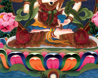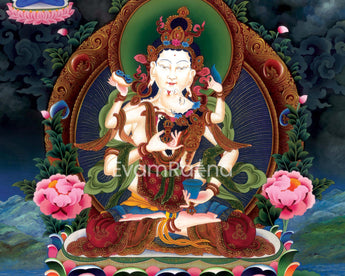 The skilled artisans of Karma Gadri have crafted a stunning Vajrasattva Yab Yum Thangka. The white face of Dorje Sempa and his consort are illuminated by a halo of orange with delicately patterned gold. In his right hand, he holds a Vajra, symbolizing compassion, and in his left hand, a bell, symbolizing wisdom. Serenely, he sits atop a lotus seat on a moon disc, his legs crossed, indicating his detachment from the unclean cycle of samsara for the benefit of sentient beings.
