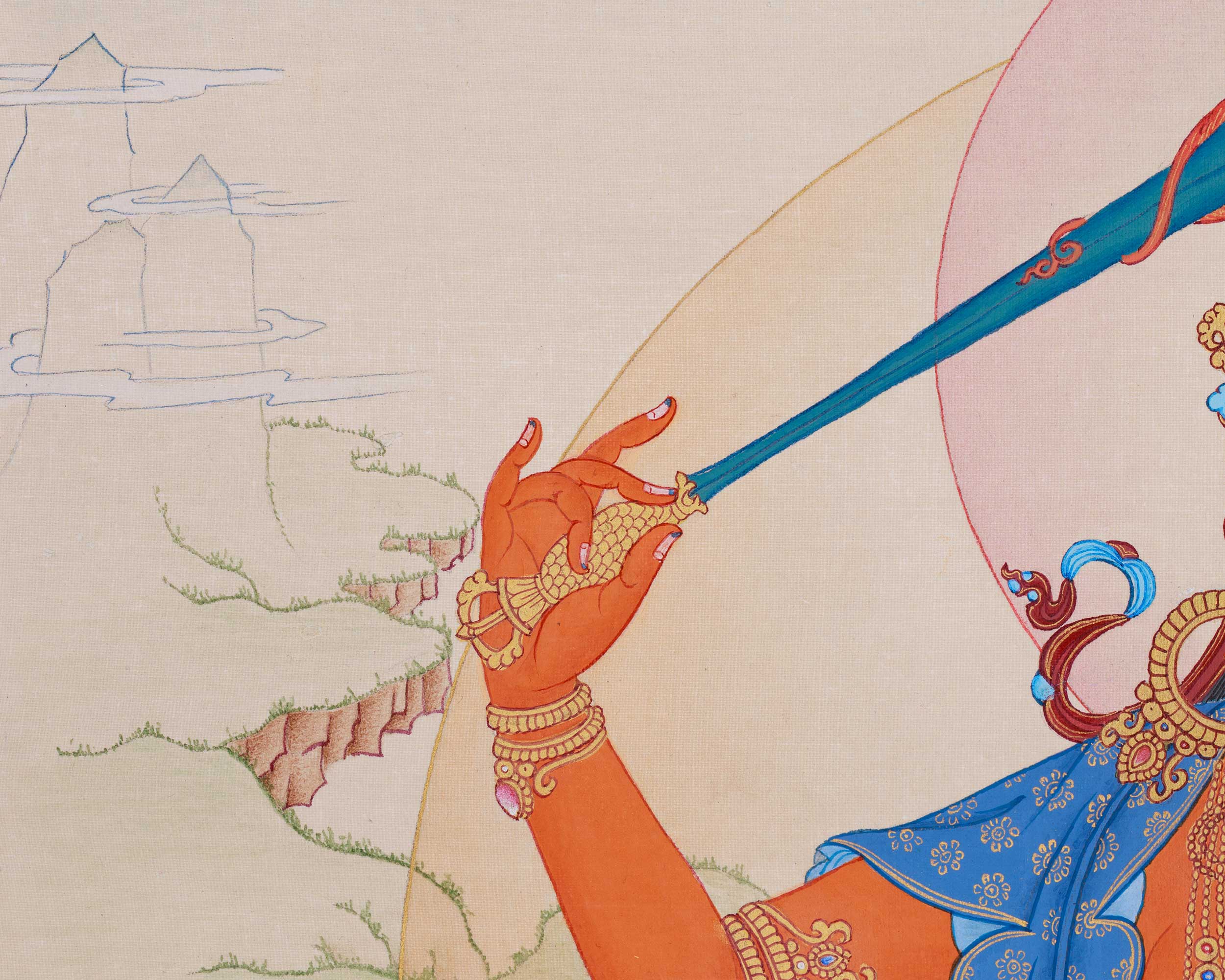 In this thangka, he is depicted with his characteristic features: the flaming sword of wisdom in his right hand, symbolizing the removal of delusion. The Prajnaparamita sutra rests on a lotus in his left hand, signifying the core of the ultimate truth. His glowing expression, jeweled crown, and flowing silks showcase his enlightened majesty. At the same time, the serene natural setting in the Karma Gadri style further underscores his role as the bringer of enlightenment and knowledge. This thangka is not only a stunning piece of art but also a deep spiritual symbol that inspires wisdom, clarity, and enlightenment in all who see it.