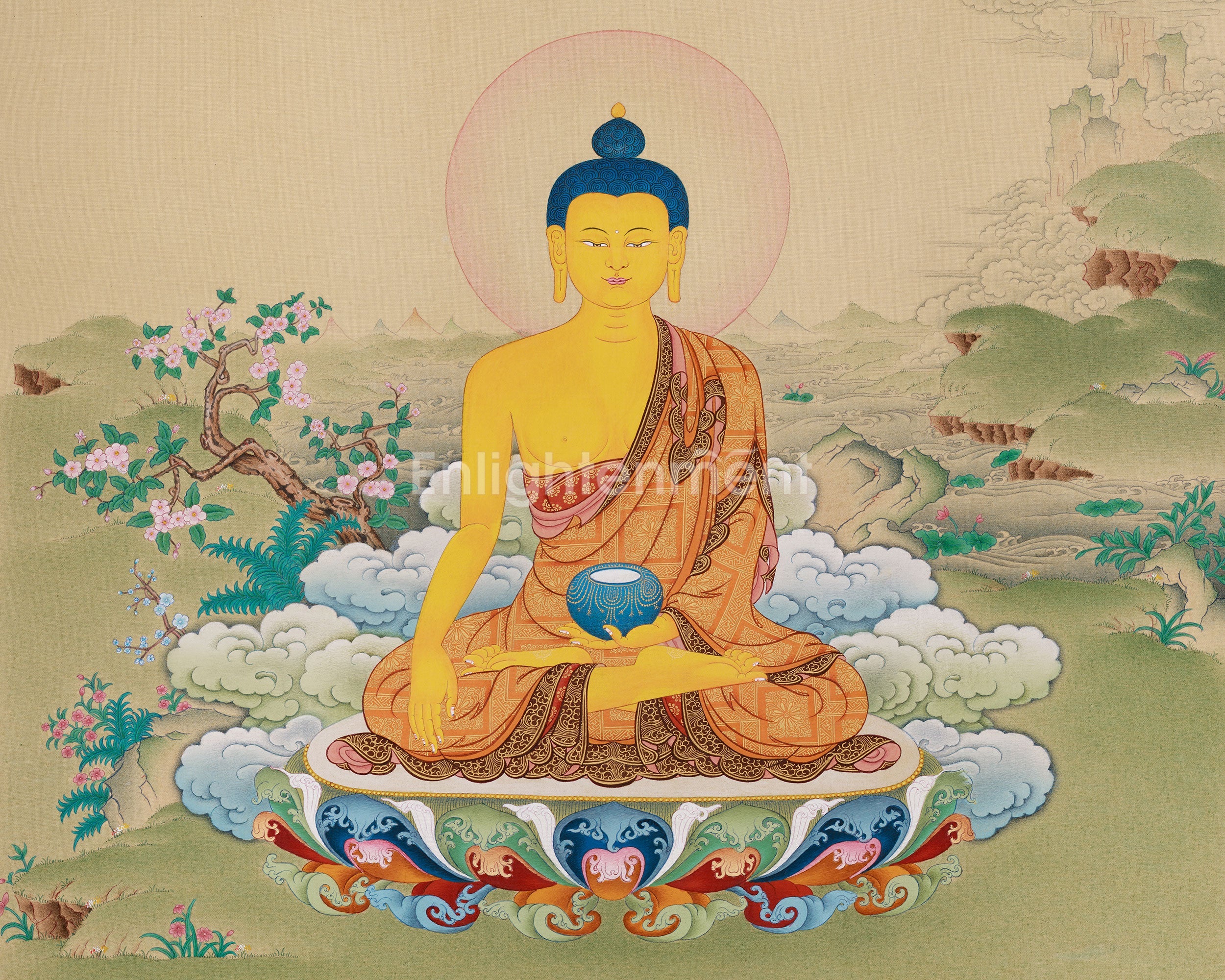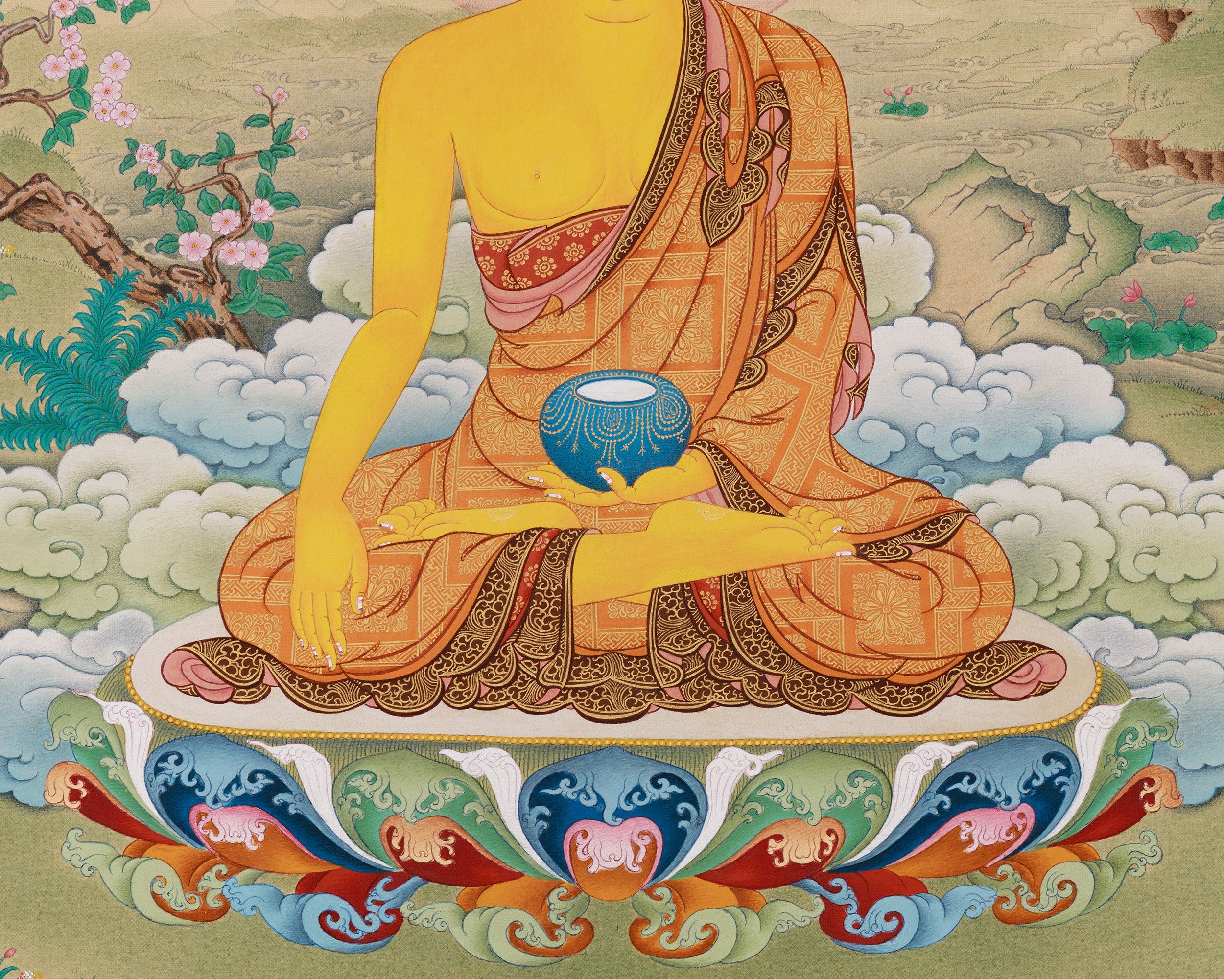 This awakened Shakyamuni Buddha, created with love and expertise, radiates beauty and sacred significance. Meticulously handmade on fine cotton canvas, it features natural Lhasa stone colors ground and prepared to produce vibrant hues. Genuine 24K gold is carefully applied to accentuate the divine glow, giving the figure and details a luminous quality. Painted by hand in the traditional Karma Gadri style, this thangka represents centuries of Tibetan artistic heritage, with each brushstroke imbued with spiritual purpose and serene focus.