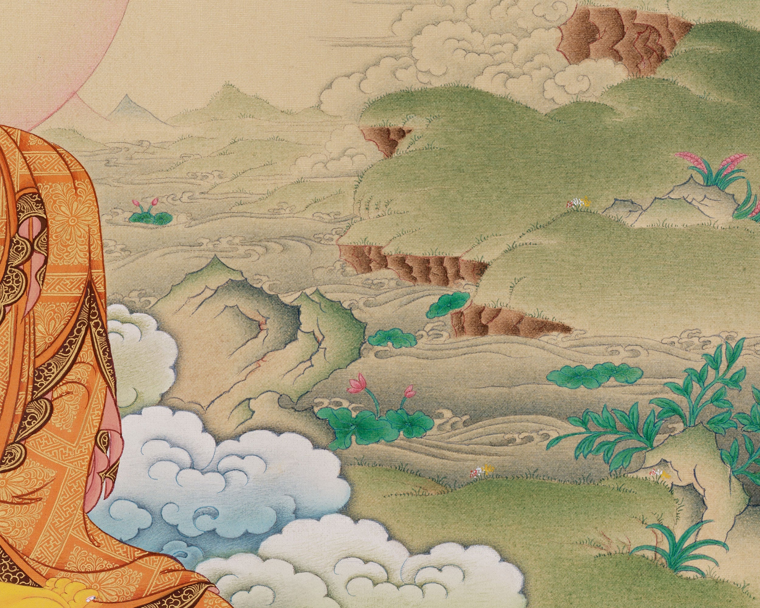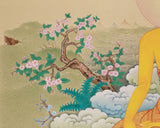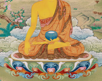 Shakyamuni Buddha, known as the Dharma Teacher, embodies the core qualities of wisdom and compassion central to Buddhism. Born as Siddhartha Gautama, he attained enlightenment under the Bodhi tree and taught profound lessons intended to liberate all beings from suffering. In this thangka, Shakyamuni is shown with a serene expression, his right hand in the earth-touching mudra—signifying his enlightenment—and his left hand in meditation on his lap. The artist uses the Karma Gadri style to portray the enlightened figure amid broad landscapes and intricate details, emphasizing clarity, purity, and his boundless presence.