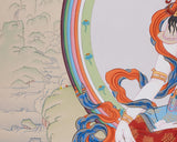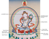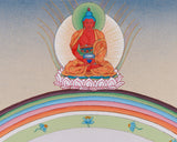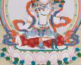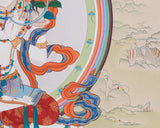 White Tara, deeply revered in Tibetan Buddhism, is a goddess of healing, longevity, and boundless compassion. She's often called upon for protection from illness, to extend life, and to foster wisdom. In this thangka, she sits serenely on a lotus throne, cradling a delicate lotus in her left hand. Her seven eyes—on her face, palms, and soles—represent her all-seeing compassion, which watches over all living beings. Above her is depicted Amitabha Buddha, her spiritual teacher and guiding presence, highlighting her enlightened heritage. This unique composition combines White Tara’s healing energy and Amitabha’s blessings, making the thangka a powerful symbol of spiritual renewal, protection, and inner peace.
