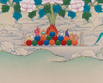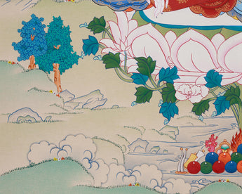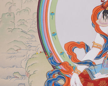 Discover a beautiful Bodhisattva White Tara painting, lovingly hand-painted in our Enlightenment Studio in the traditional Karma Gadri style. Known for its spacious backgrounds, realistic landscapes, and intricate details, this style emphasizes calmness and clarity—ideal for capturing White Tara’s compassionate presence. Created using natural pigments and soft gold accents, the thangka radiates with lively colors and profound beauty. It gently celebrates the rich Tibetan artistic tradition, making every painting feel truly sacred and cherished.