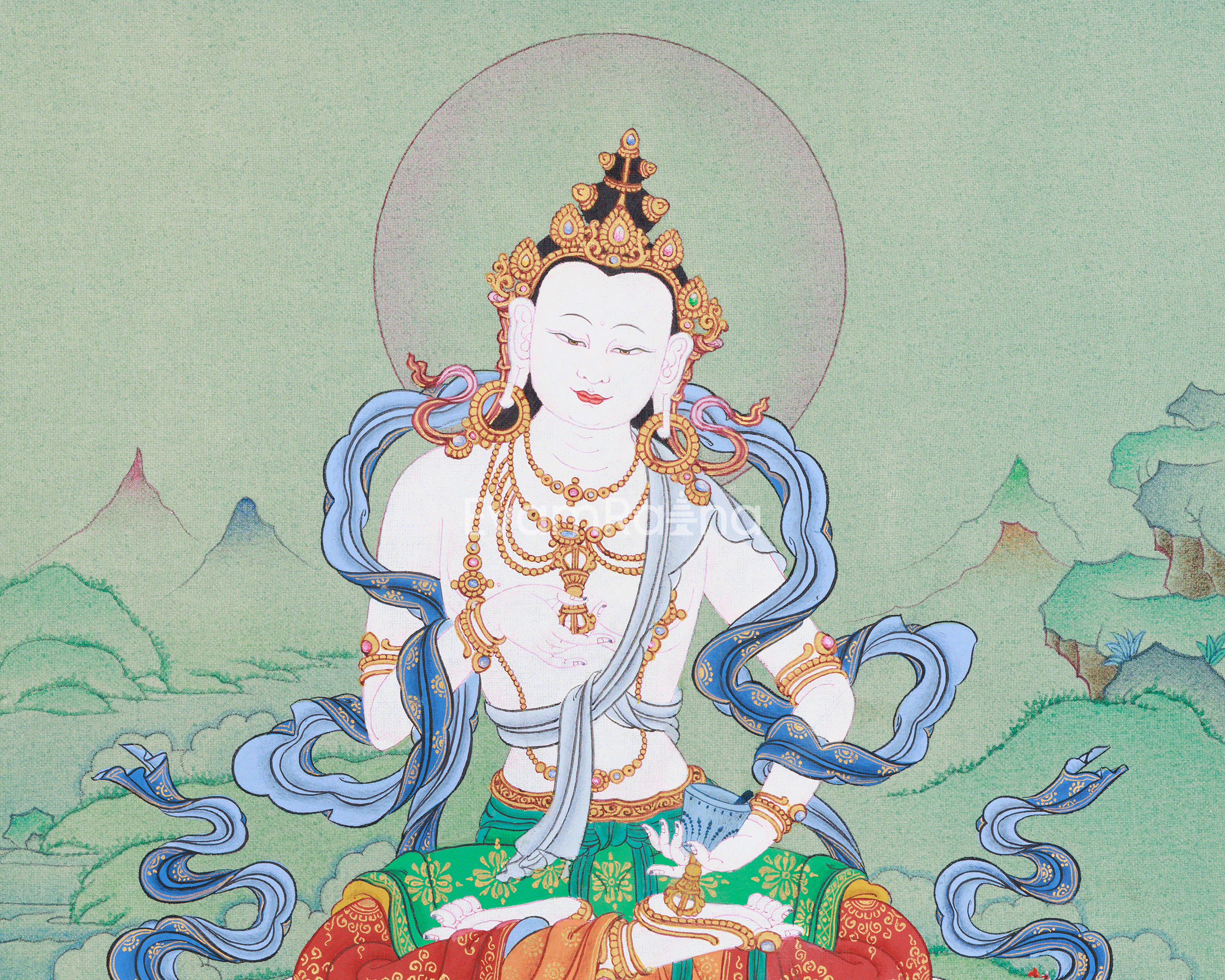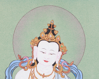 A hand-painted thangka, created by skilled Nepalese artisans in the Karma Gadri style, reflects the purity and spiritual grace of Dorje Sempa (Vajrasattva). It is made on fine cotton canvas using vivid acrylic colors and 24K gold. The richness of acrylic enables luminous layering and refined detailing, bringing the deity's serene majesty to life with striking clarity. The 24K gold applied to his ornaments, throne, and aura captures and reflects light with sacred brilliance, enhancing the painting's divine presence and spiritual radiance. Cotton canvas, known for its ritual purity and durability, serves as the ideal foundation for this captivating and deeply meditative artwork.